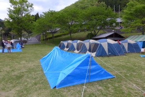 ドーム型のテントは荷物置き場にして、ブルーシートのテントで寝泊まりをします。
