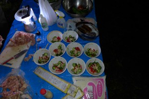 夜は強風が吹いたため、せっかくブルーシートでテントを立てたのに、吹き飛ぶ可能性があったため、急遽撤去し、ドームテントに避難しました。