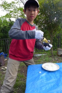 朝食の様子。火起こしにリベンジ。いくつかの班では火起こしに成功していたようです。